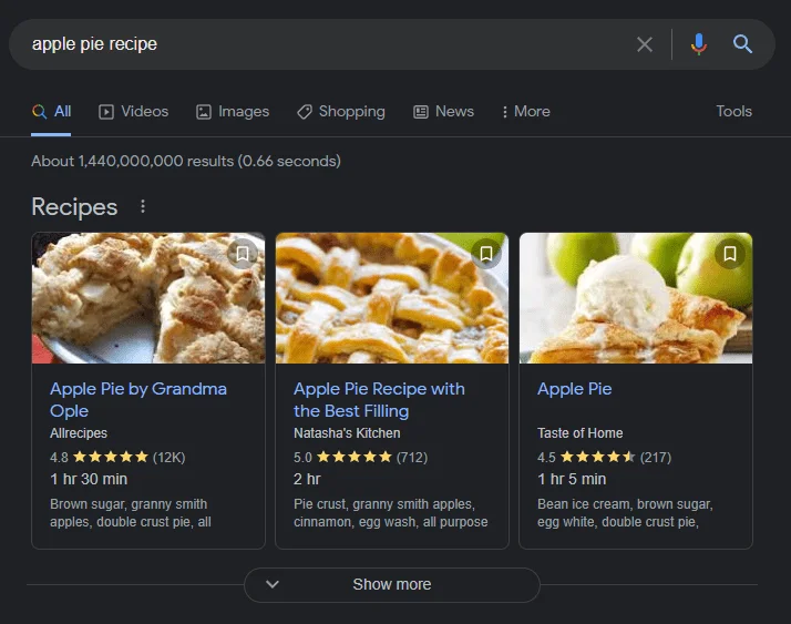 Si vous recherchez une recette, un résultat de recherche peut afficher les temps de cuisson, le type de cuisine et d’autres informations pertinentes. Il peut même afficher une image miniature de la recette que vous avez recherchée.