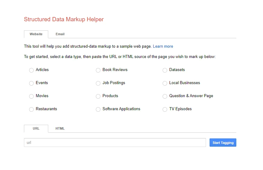 - Google Structured Data Markup Helper — Cet outil Google est similaire au Data Highlighter. Mais dans ce cas, vous êtes en mesure de catégoriser les pages à un niveau plus profond. Ici, vous pouvez définir le type de contenu proposé par votre site. Vous pouvez spécifier la catégorie de votre page de destination : article, événements, films, restaurants, critiques de livres, offres d’emploi, produits, logiciels, ensembles de données, entreprise locale, page de questions-réponses ou épisode télévisé. Ensuite, vous pouvez commencer à baliser votre page de destination pour plus de détails.