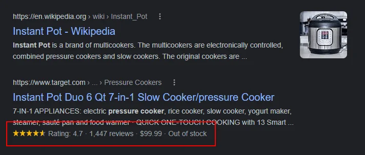 Dans le cas de l’exemple ci-dessus, l’extrait enrichi de la liste Instant Pot de Target comprenait des détails tels que la note du produit, le nombre d’avis, le prix et l’état du stock.