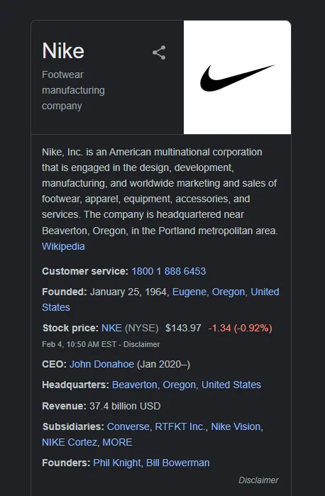 Un graphe de connaissances peut inclure d’autres informations que les gens peuvent trouver utiles, comme le cours actuel de l’action d’une entreprise, son PDG, ses revenus et ses filiales. Vous pouvez également trouver des liens vers ses pages officielles de médias sociaux. Vous pouvez également découvrir des recherches associées.