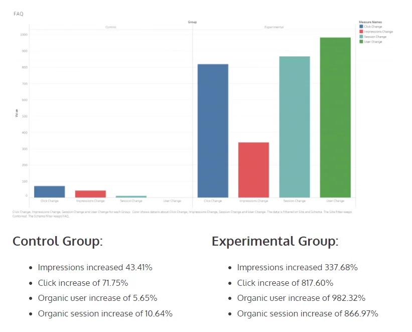 Simplified Search a présenté ses conclusions sur l’impact du balisage des données structurées. Dans le cas des questions fréquemment posées (FAQ), il y a eu une augmentation de 817,60 % des clics par rapport aux 71,75 % de clics enregistrés pour le groupe témoin.