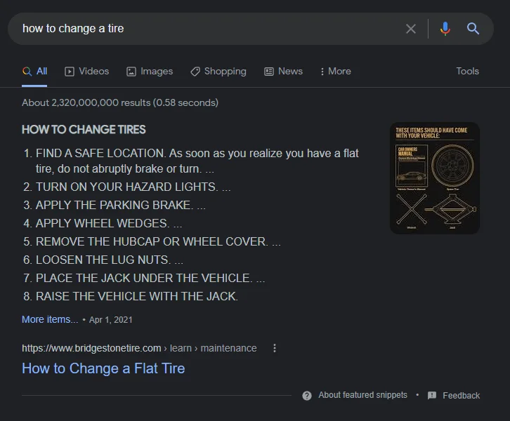 Dans l’exemple ci-dessus, le featured snippet répond à la question « comment changer un pneu » en affichant un guide étape par étape. Cependant, un featured snippet peut également se présenter sous la forme d’un graphique, d’un tableau, d’une liste, etc. Cela dépendra du contexte de la requête de recherche.
