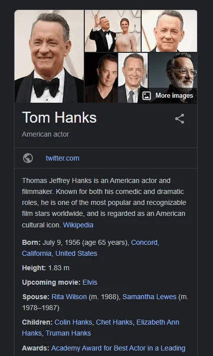 Si vous avez recherché une personne réelle telle qu’une célébrité, vous pouvez trouver une courte autobiographie avec l’âge, la date de naissance, la taille, la famille et les distinctions de cette personne. Vous verrez également une liste de films ou d’émissions de télévision dans lesquels ils ont joué.